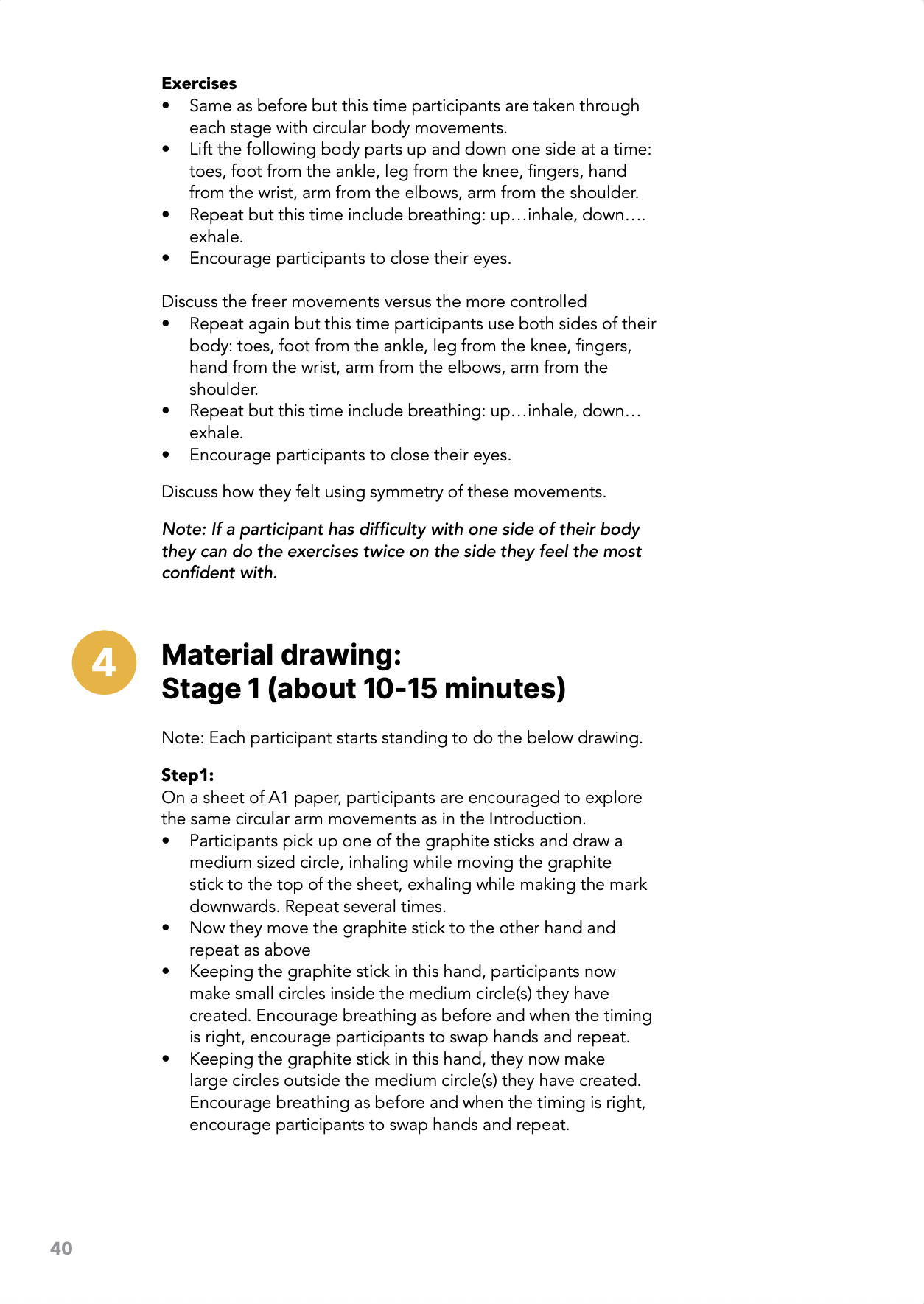 Yes, you can run a group exclusively for people living with neurological conditions or exclusively for supporters. The ideal group size is 8 participants, as this allows the facilitator and assistant to follow the group closely and provide individual support when needed, while maintaining the energy and benefits of a group activity. Participants benefit from watching others create, drawing inspiration from one another, and enjoying a social environment. Groups smaller than 4 people tend to lose this collective energy.